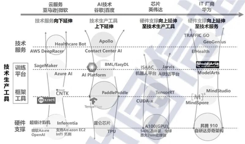 亚马逊、微软等云服务企业不断强化其智能服务能力, 紧抓面向基础技术服务、研发训练与推理等智能计算需求,通过布局研发平台、开源开发框架等技术生产工具,以及更为底层的专用硬件及芯片,提升其智能计算服务的竞争力;谷歌、百度等 AI技术优势显著的互联网头部企业基于先进算法和技术优势布局开源框架,并以此为核心上下延伸,构建智能服务生态体系。