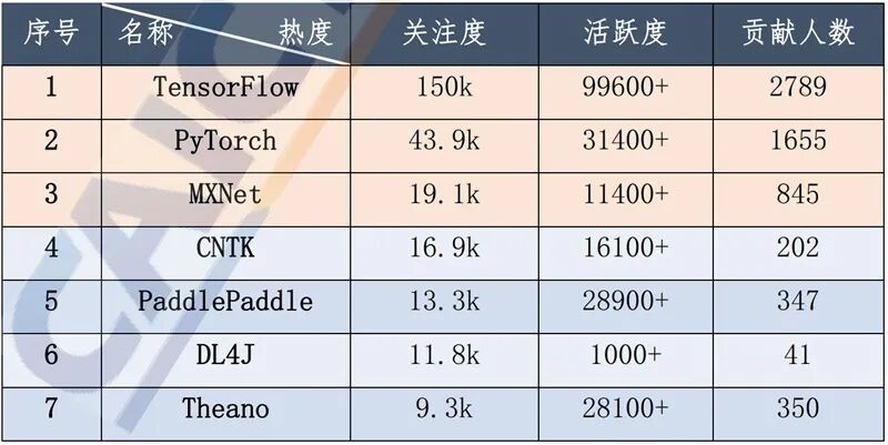 以谷歌 TensorFlow、脸书 PyTorch 等为代表的开源框架格局初显清晰,框架格局已从百花齐放转向几家分争。目前,业界开源开发框架主导权基本被 TensorFlow(谷歌)、 PyTorch(脸书)等掌握;微软CNTK、日本初创企业首选网络( preferred networks) Chainer、 加拿大蒙特利尔大学主导的 Theano 等早期热点框架已通过与主流框架合并或直接停止更新的方式退出历史舞台。